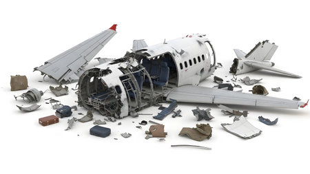Aviation accident concept showing damaged aircraft remains, isolated on white for safety and editorial themes. High quality photo