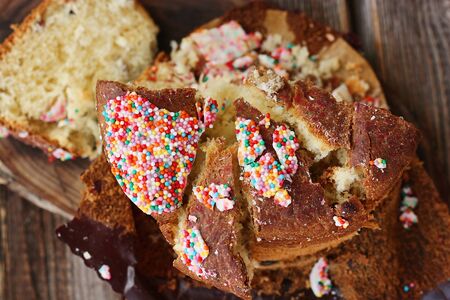 Fragments of broken yellow plate are randomly located on old wooden surface. Sharp edges. Danger of cuts. Traces of peeling paint on wooden board. Top view. Close-up. Selective focus. Copy space.