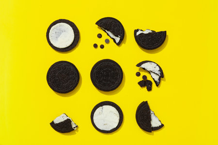 Oreo Biscuits with cracked and crumbs on white background. It is a sandwich cookies filled with sweet cream flavored is the best selling dessert in Thailand.