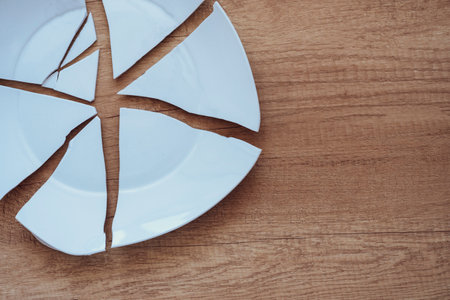 Shards of a Broken Plate on the background. splinters of a shattered Plate. Fragments of a tableware on the floor. splinters and debris of a kitchenware