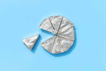 Flat lay with a home-baked pumpkin pie on a dark blue colored background. Pumpkin pie sliced in eight pieces. Homemade thanksgiving dessert.