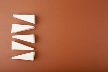 Creative flat lay with white triangle shaped make up sponges isolated on brown background with copy space. Concept of make up and visage for dark skin tones