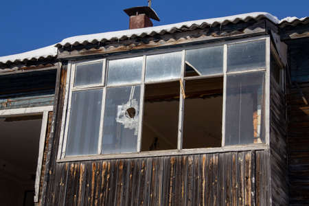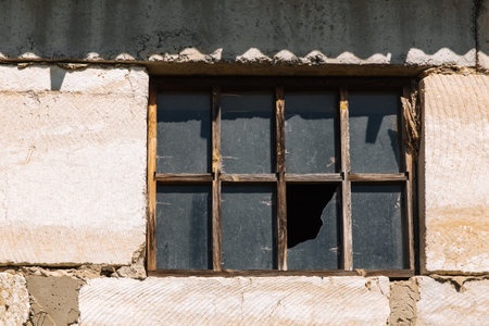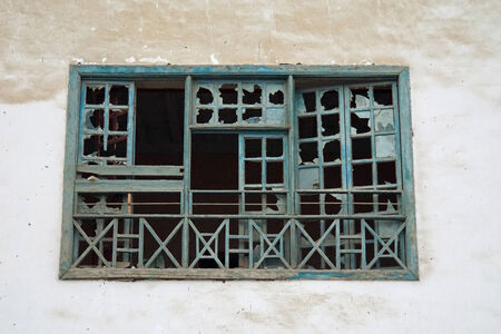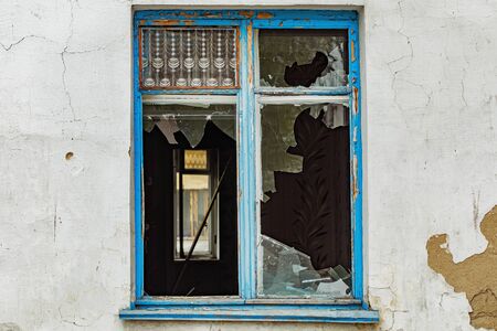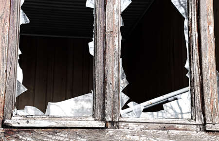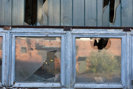 Smashed windows on the house. Broken glass on the wooden windoes. Old and demolished windows on the building