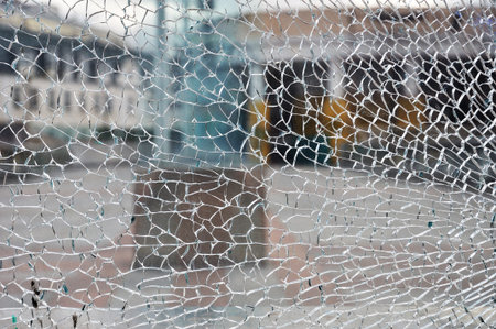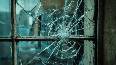 Vandalized office window close up with shattered glass depicting vandalism or accident scene