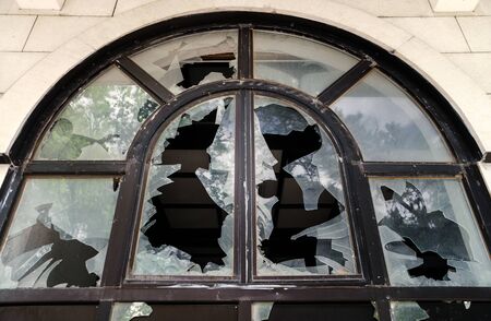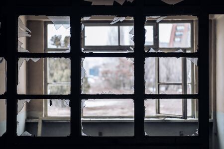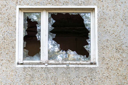 broken window in a residential building, hostilities, housing security.