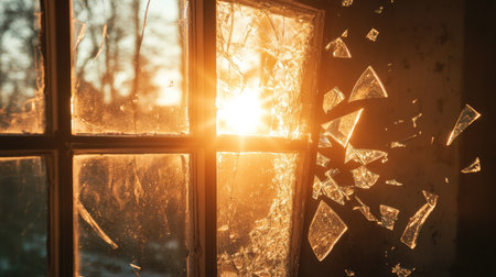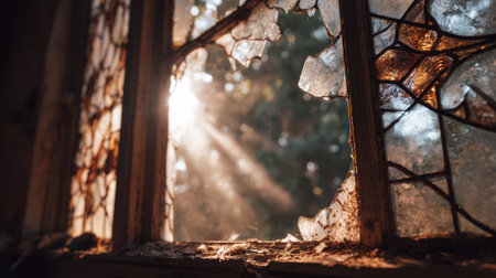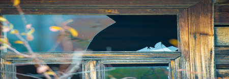 fragments of broken glass of a window in an old house
