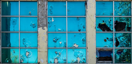 Broken windows in an old abandoned industrial building.