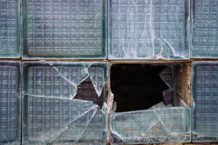 Old broken glass block window, close up view.