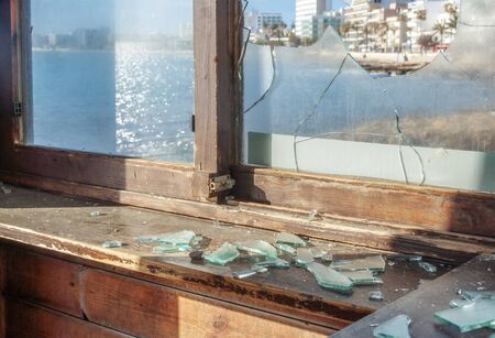 Vandalism broken window glass with pieces of glass in the foreground. In the background, the Mediterranean Sea is out of focus