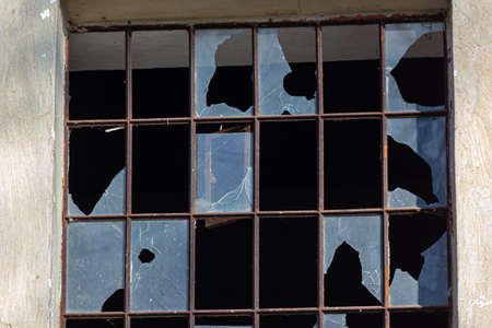 Smashed glass on a broken window on an abandoned and decaying factory industrial building left neglected.