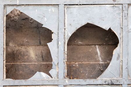 Blurred broken dust Glass door texture background, Rusty metal frame, Close up shot, Selective focus, Reflection, Home decor repair concept