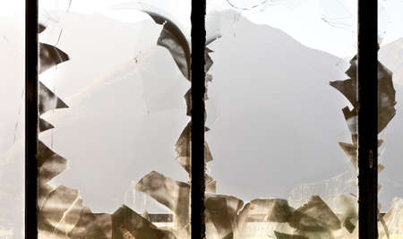 Broken glass in the window of old abandoned hotel, Croatia