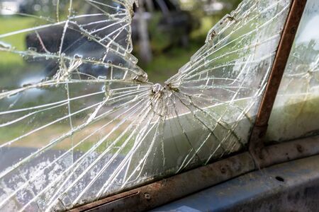 Broken glass window of an old rusty car.