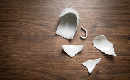 Pieces of shattered dishes. Splinters and Fragments of the broken white ware on a floor. Metaphor of a family quarrel. Broken Plate on brown Background
