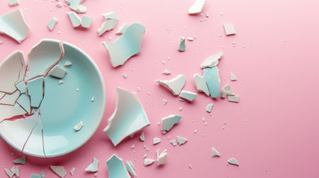 A captivating collection of colorful broken ceramic tiles arranged chaotically on a white surface, creating an intriguing abstract composition ideal for artistic backgrounds.