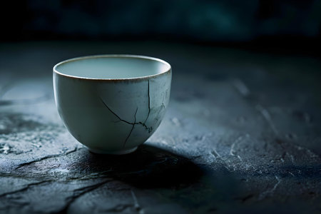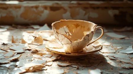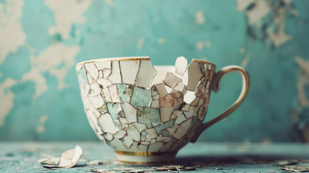 Shattered fragments of a vintage cup are meticulously mended together symbolizing the delicate nature of forgiveness in relationships resting quietly on a weathered table.
