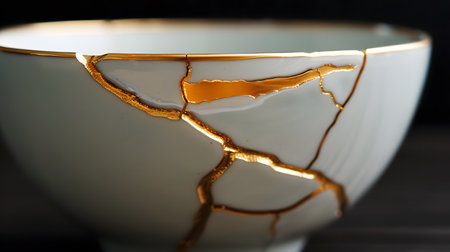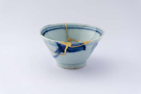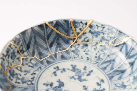 Kintsugi pottery. Gold cracks restoration on old Japanese pottery restored with the antique Kintsugi restoration technique. The beauty of imperfections.