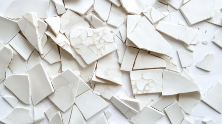 A collection of shattered white ceramic pieces scattered on a clean surface, showcasing unique textures and cracks, ideal for artistic or design projects.