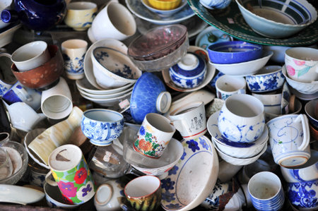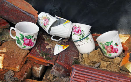 Shards of ceramic cups with flora pattern on the old asphalt.