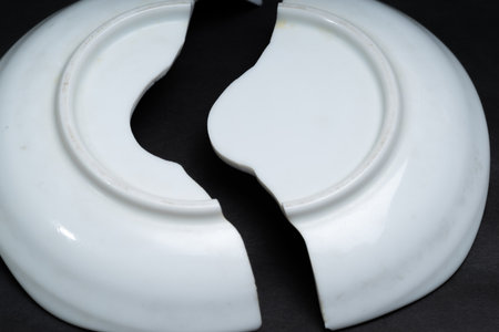 Broken Plate on Black Stone, White Ceramic Pieces, Smashed Crockery Bowl, Stress Concept, Porcelain Shards on Black Background