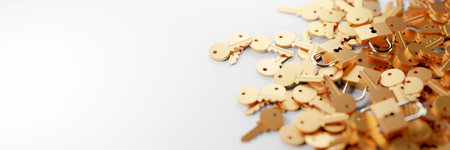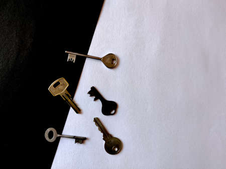 Various metal keys on white background. Copy space.Selective focus