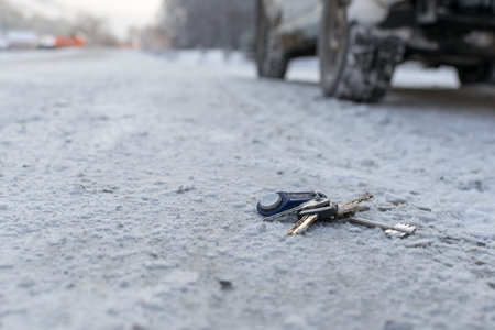Lost car keys on distressed road painted yellow lines