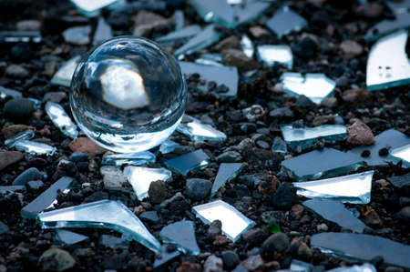 Pieces of broken mirror and a lens ball on the ground.