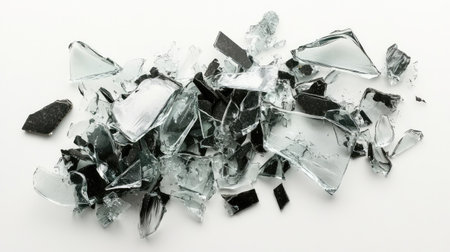 A visually striking arrangement of broken glass pieces sits on a white background, capturing the intricate details and sharp edges of the shattered fragments.