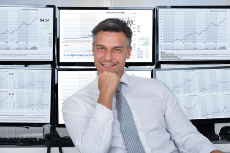 Relaxed trader leaning back in his chart and looking at ascending chart on computer monitors in front of him