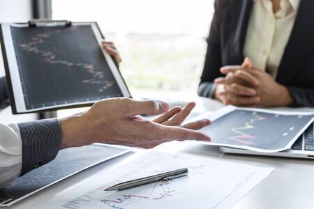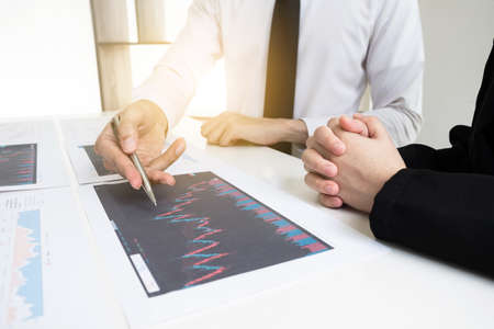Two business people are discussing and analyze strategy of investment from the stock graph in the office room, Business and finance concept.
