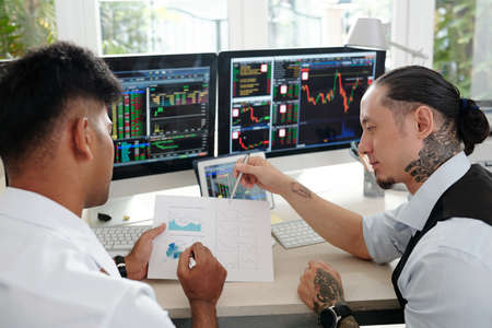 Serious young brokers analyzing charts and diagram before opening of stock exchange
