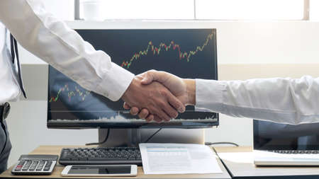 Investor stock trading of business partners shaking hands against screen for cooperating of investment agreement of highest valued technology product trending on the dynamic market stock. Sellable.