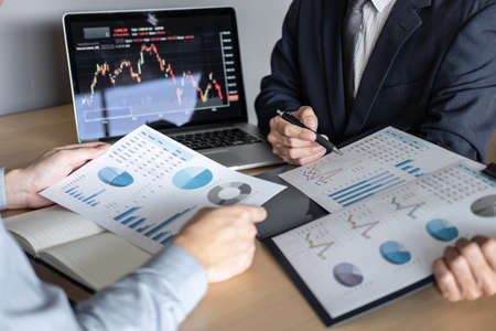 Business team on meeting to planning investment trading project and strategy of deal on a stock exchange with partner, financial and accounting concept, collaborative teamwork analyze data.