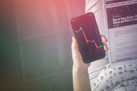 Stock market investment app in hand. Telephone with a stock chart. Screen close-up