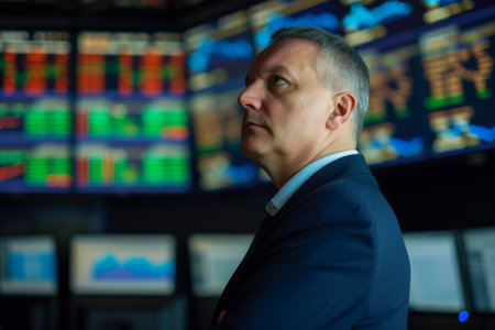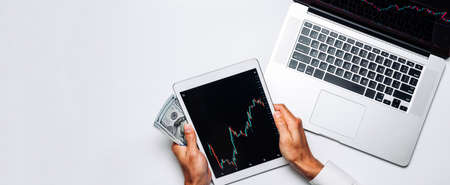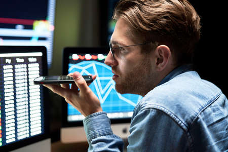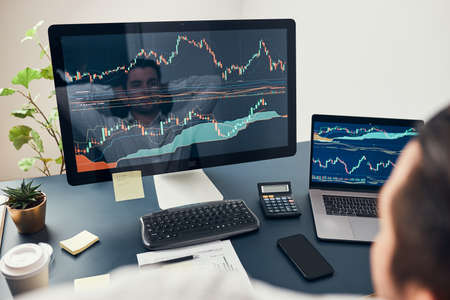 Caucasian businessman trading online, using computer technology, looking on stock exchange trade and analyzing