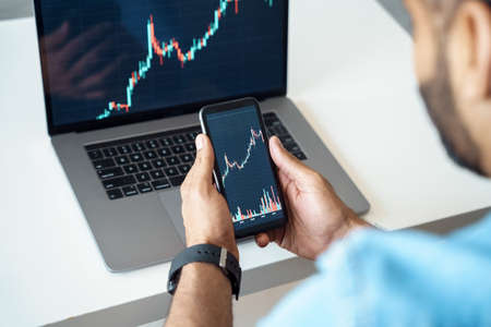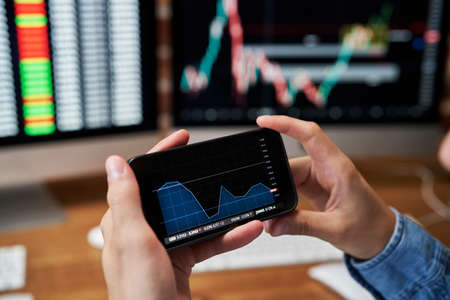 Cropped photo of male hands holding smartphone in front of computer screen analyzing financial stock market trading data charts, following investment growth graphs on phone and laptop monitors