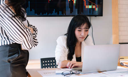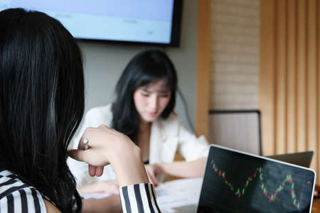 Business people meeting in office and discussing over a documents, two woman with a financial report with partner colleague on laptop computer