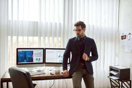 Confident businessman in classic wear and eyeglasses standing near his workplace in the modern office, analyzing statistical data, financial graphs and charts on computer screen