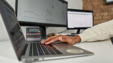 Closeup of hand of male trader working on a laptop, using online software to analyze price statistics while trading from home
