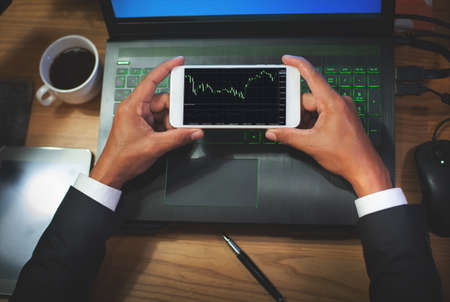 Top view of Businessman hands treading stock market by mobile phone Analysis economy data with computer screen