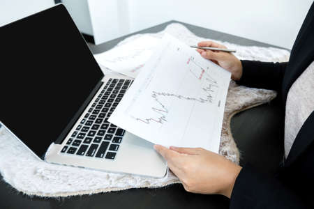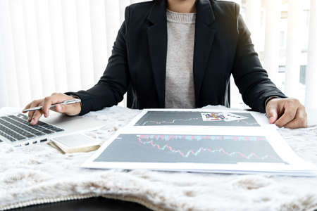 Trader businesswoman analyze stock graph and report, set targets for online forex trading market management success.