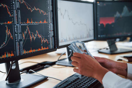financier works in an online trading terminal, cryptocurrency exchanges and securities exchanges. The investor works late in international markets, a dark cabinet, an image with a small depth of focus