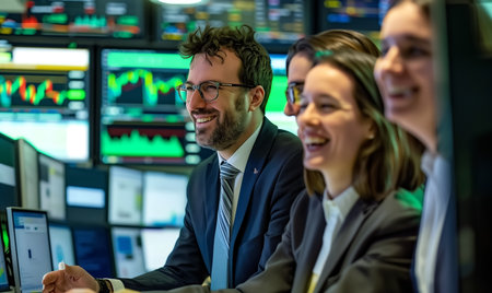 Stock Traiding. Traders sitting at office monitoring market analyzing data concentrated discusssing strategy
