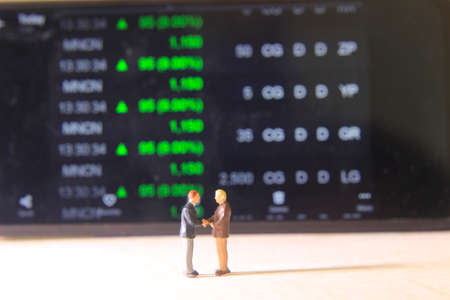 Simple Photo, Illustration for Senior Investor Mini Figure Toy Standing 2 businessman Handshaking and watching Running Stock Exchange