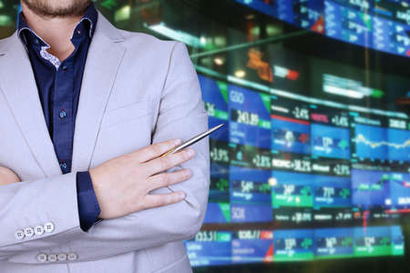 Businessman, broker analyzing stock market changes, falling and rising numbers and lines on the chart. The concept of trade and consulting. high quality photo