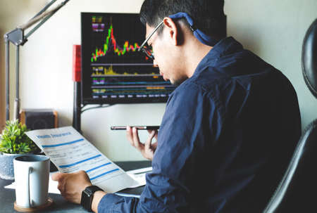 Businessman trading stocks online. Stock investor analysing numbers at graphs and charts. Investor planning and analysing stock market profiit. Man working with stock chart data. Business man investing stock using online platform. Business success concept
