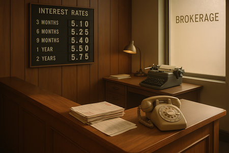 A detailed view of a vintage brokerage office, featuring a prominent interest rates board, a classic rotary phone, and an old manual typewriter. The wood-paneled interior and traditional office equipment evoke a nostalgic sense of historical finance and a bygone era of banking and investment.