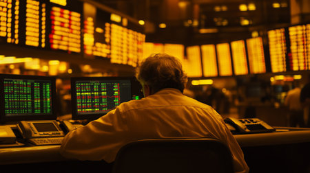 Investor analyzing market trends in a busy financial trading room during evening hours with illuminated stock boards