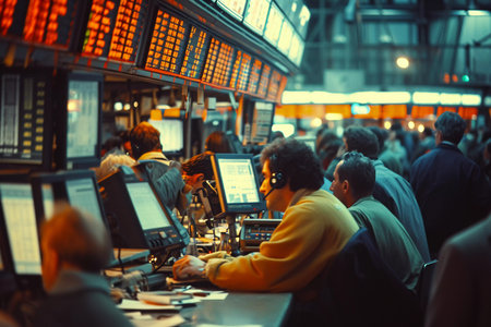 Inside a bustling stock exchange with traders active at work during a busy trading session in the late afternoon