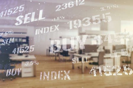Multi exposure of virtual abstract financial diagram on a modern furnished office interior background, banking and accounting concept